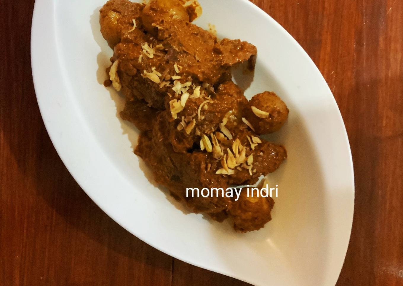 - Terakhir ketika daging mau masak sekitar 30 menit lagi, masukkan kentang dan serundeng/bumbu onehnya. Masak hingga airnya kering sambil diaduk-aduk. Selamat mencoba