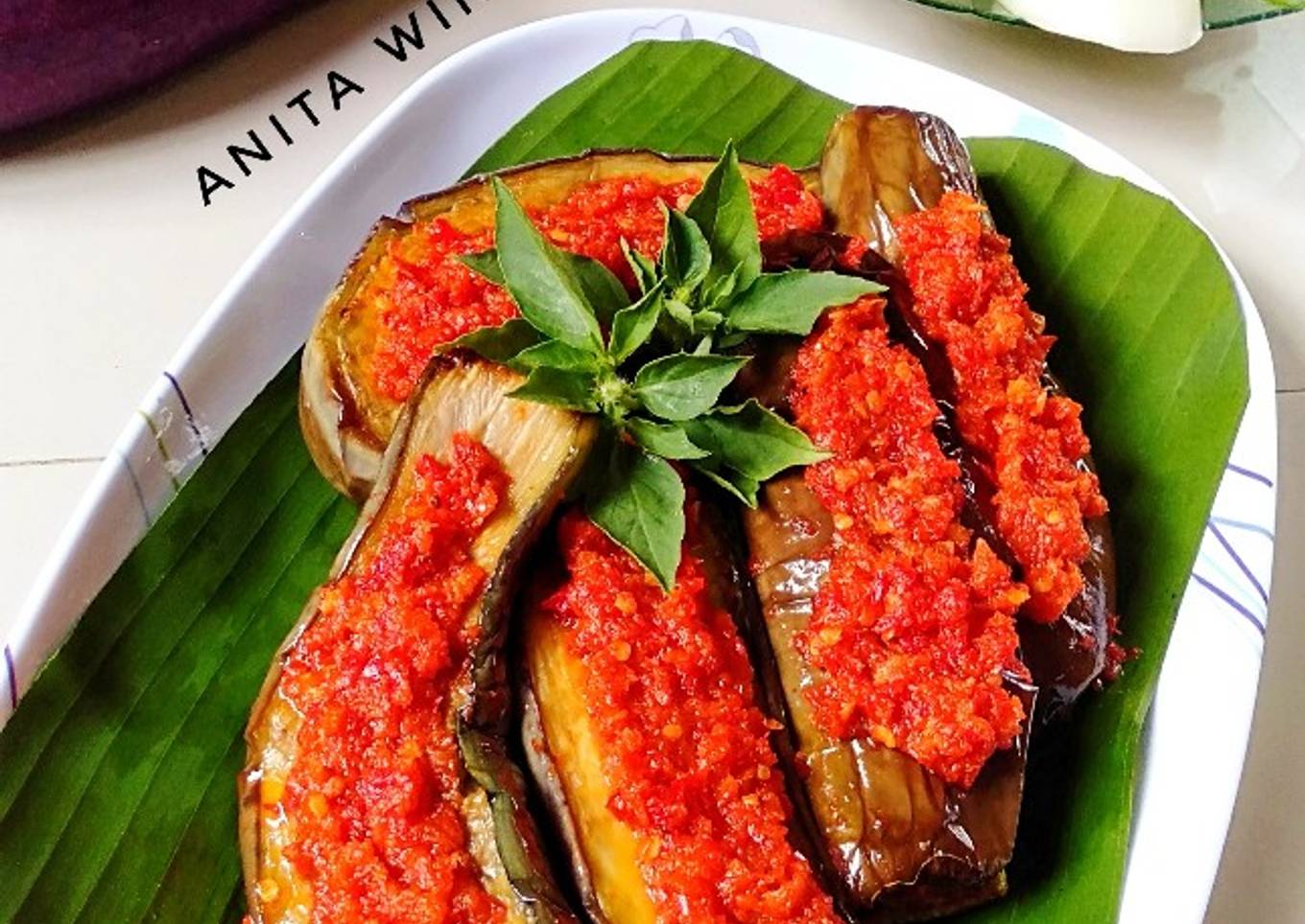 - Tata terong di piring saji dan siram dengan bumbunya. Sajikan dengan lalapan timun, kemangi serta tempe dan tahu goreng