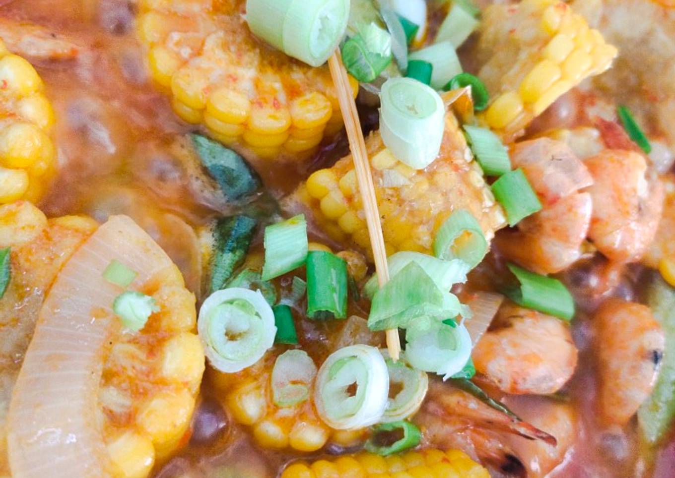 - Lalu tambahkan air, masukan saos tiram, saos tomat, saos sambal, garam gula kaldu jamur, udang, dan jagung manis.