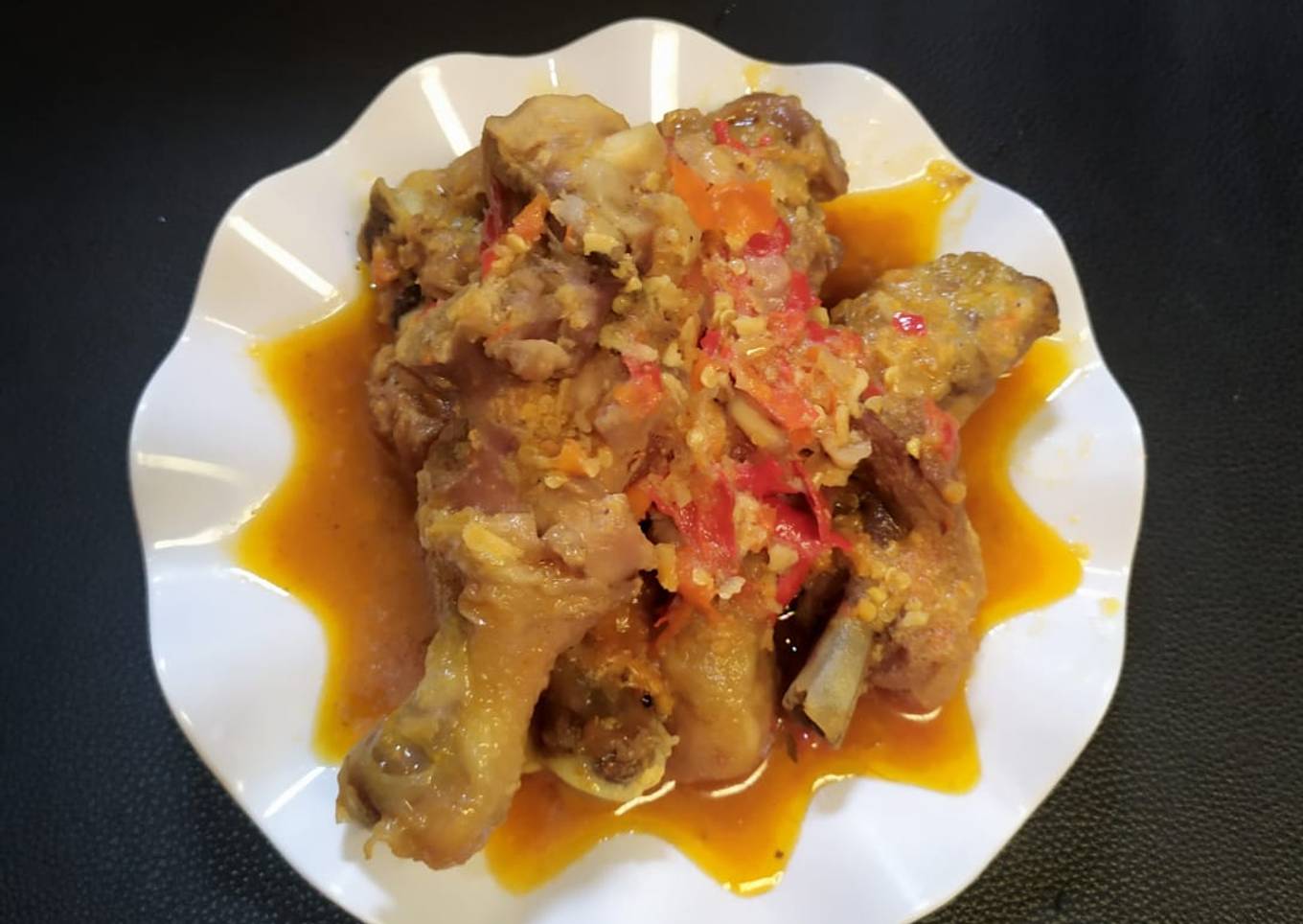 - Tambahkan air, tunggu sampai mendidih. Masukkan ayam. Masak sampai kuah asat.