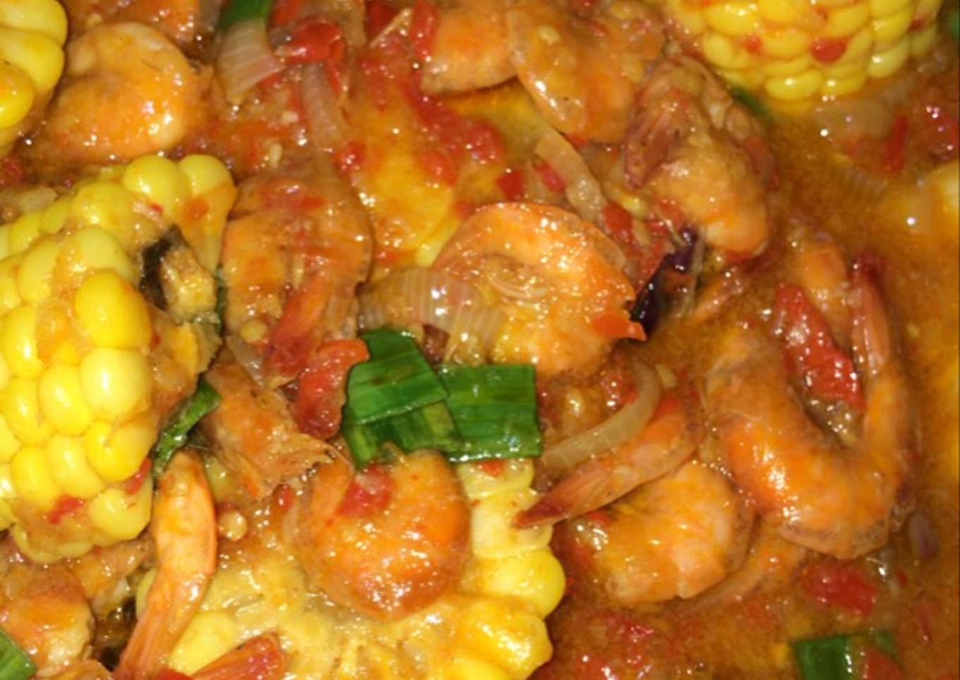 - Tambahkan daun jeruk, jahe, saos tomat, saos sambal, saos tiram, gula pasir dan seasoning. Aduk rata. Masukan udang dan jagung. Aduk rata.