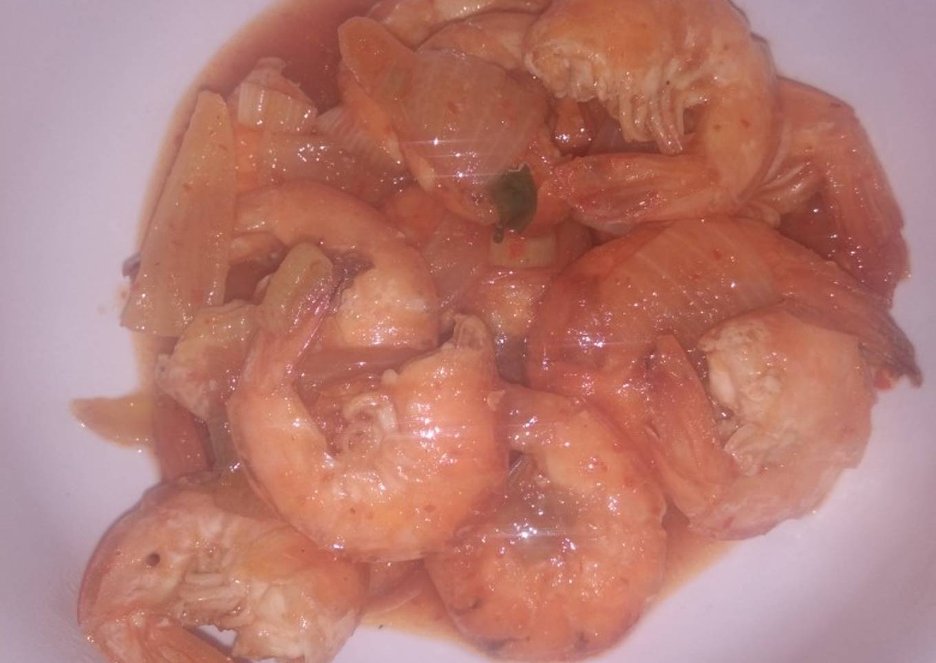 - Beri saos tiram, saus tomat, garam, merica dan kaldu jamur. Koreksi rasa. Lalu masukkan udang yang digoreng tadi aduk2